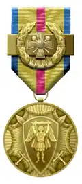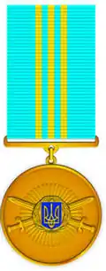 Awards and decorations of the Ukrainian Armed Forces are military decorations issued by the Ministry of Defence of Ukraine to soldiers who achieve a variety of qualifications, who have completed classroom training standards stipulated in their military occupational specialty and accomplishments while serving on active and reserve duty in the Armed Forces of Ukraine. Together with military badges, medals are a means to outwardly display the highlights of a service member's career. These badges are worn in order of precedence (Master the highest). Only badge of the highest degree worn.[1]