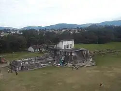 According to a drawing made by Rivera y Maestre in the early 19th century, the temple of Awilix was not as tall as the temple of Tohil.[16] This structure was apparently the second most important temple in Qʼumarkaj.[17] Originally this temple was formed of a large rectangular platform supporting a smaller platform and a temple structure on the east side.[18] A wide stairway climbed the west side of the temple, it was flanked on the lower level by two large talud-tablero panels.[19] The exterior stonework of the building has been completely stripped away.[20] There were four principal phases of construction and there is evidence that the temple had been repaired various times prior to the Spanish conquest.[21] The floor under the third phase of construction had been painted dark green.[22] Archaeological investigations found fragments of incense burners underneath the first building phase.[23]