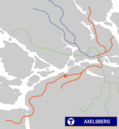 Axelsberg metro station is a station on the red line of the Stockholm metro, located in Axelsberg in the district of Hägersten. The station was opened on 16 May 1965 as part of the extension from Örnsberg to Sätra.[3] The distance to Slussen is 6.4 km.
