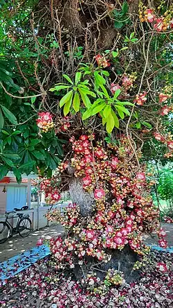 Couroupita guianensis, known by a variety of common names including cannonball tree,[3] is a deciduous tree in the flowering plant family Lecythidaceae. It is native to lowland tropical rainforests of Central and South America, from Costa Rica, south to Brazil and northern Bolivia[1] and it is cultivated in many other tropical areas throughout the world because of its fragrant flowers and large fruit, which are brownish grey.[4] There are potential medicinal uses for many parts of Couroupita guianensis, and the tree has cultural and religious significance in South and Southeast Asia.[5] In Sri Lanka and India, the cannonball tree has been widely misidentified as the Sal tree (Shorea robusta), after its introduction to the island by the British in 1881, and has been included as a common item in Buddhist temples as a result.[6]