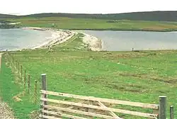 The term "ayre" is sometimes wrongly applied to sand tombolos (e.g. St. Ninian's tombolo in Shetland) and to the lakes and lagoons impounded by bay-head bars, which are more properly called oyce[5] in Orkney and houbs in Shetland.