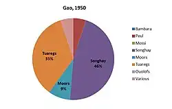 The area was traditionally inhabited by the settled Songhay, and the nomadic Tuareg, Arabs, and Fulas (Fula: Fulɓe; French: Peul).[66] The ethnic composition of the regions in 1950 (at that time, Kidal Region was a part of Gao Region) and in 2009 is shown in the adjacent diagrams.