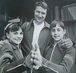 Romanian Federation officials criticized Károlyi because of his score protests at several international meets, including the 1980 Olympics.[5] After the 1980 Olympics, Károlyi clashed with Romanian Federation officials, and tension escalated. During a 1981 gymnastics tour, Romanian team choreographer Géza Pozsár and the Károlyis defected and sought political asylum in the US, temporarily leaving their seven-year-old daughter Andrea with relatives in Romania.[6] They settled in Texas.[5][7][8]