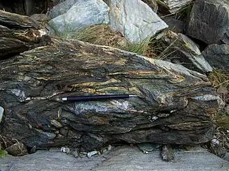 The Bündner schists can be found throughout the Penninic zone of the Alps, often forming zones of high strain between or large infolded synclines (so called Mulde or Mulden) in the crystalline nappes that are made of more competent gneiss.[1]