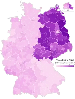 The BSW contested its first elections in May. In June, the party won 6.1% of votes nationally in the European Parliament elections. In September, it won between 11% and 16% in three eastern state elections in Saxony, Thuringia, and Brandenburg.[17] As of 2025, the BSW is part of governing coalitions in two states: Thuringia (Blackberry coalition) and in Brandenburg (Red–purple coalition).[18] In the 2025 German federal election, the party received 4.981% of second votes, narrowly missing the 5% threshold required to be allocated seats in the Bundestag.[19][20]
