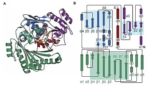 As mentioned above, BBE-like enzymes are in the large family of FAD-linked oxidases. Regarding the structure of this particular family, they have a FAD binding module formed by the N- and C- terminal parts of the protein. There is a substrate binding module that, in collaboration with isoalloxazine ring of FAD, disposes the environment for efficient substrate binding and oxidation.[3]