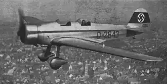 During the period of 1927–33, Messerschmitt designed a series of six sport planes, the single-seat M.17 and M.19, and the two-seat M.23, M.27 M.31, and finally the M.35.[1] With the exception of the M.23, none sold in large numbers. They were all single-engine low-wing cantilever monoplanes with open cockpits and fixed undercarriage. The M.35 kept the extended fuselage of the M.27 and combined it with an undercarriage of single leg, spatted form.[2]