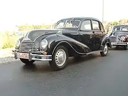 The 501 was introduced to the public in April 1951 at the Frankfurt Motor Show,[8][9] as was its less expensive, production-ready rival, the Mercedes-Benz 220. The 501 made an impression on the public with its solid engineering and its extravagance.[8] Its list price of more than fifteen thousand Deutsche Mark[8][10] was about four times the average yearly salary in Germany at the time.[8] The public nicknamed the 501 "Barockengel" (Baroque Angel) in reference to the curved, flowing style of the body, which was reminiscent of the Baroque era.[6][8]
