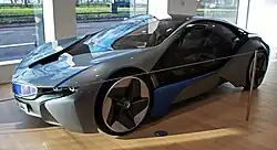The BMW i8 is a plug-in hybrid sports car developed by BMW. The i8 was part of BMW's electrified fleet and was marketed under the BMW i sub-brand. The production version of the BMW i8 was unveiled at the 2013 Frankfurt Motor Show and was released in Germany in June 2014.[12] Deliveries to retail customers in the U.S. began in August 2014.[13] A roadster variant was launched in May 2018.[14] Production ended in June 2020.[15]