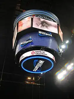 The BOK Center holds 37 public restrooms—12 men's restrooms, 16 women's restrooms, and 9 family restrooms—with 300 toilets and urinals.[1] Dressing rooms with wooden lockers, hydrotherapy and workout rooms, a players lounge, locker rooms for game officials, and office space for coaches, trainers, and equipment managers are also located within the building.[19] The arena's hanging scoreboard, is suspended above the arena floor and measures 50,000 pounds (23,000 kg) and 30 by 33 feet (9.1 m × 10.1 m), making use of four 8 by 14 feet (2.4 m × 4.3 m) HD screens, four 8 by 8 feet (2.4 m × 2.4 m) HD screens, a wrap-around 9-foot (2.7 m) HD screen, and another 3-foot (0.91 m) wrap-around HD screen. Designed by Forty Forty Agency and manufactured by Daktronics, the project received $3.6 million in private donations, with some funds going toward an advanced video recording system.[18]