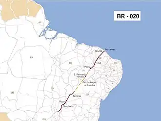 BR-020 is a federal highway of Brazil.[1] The 2,038-kilometre (1,266 mi) road connects Fortaleza in Ceará to the federal capital Brasília.[2] It was inaugurated in the government of the president Juscelino Kubitschek.
