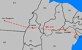 The BR-235 is a Brazilian federal highway that connects the cities of Aracaju, in the state of Sergipe, to Novo Progresso, Pará. It has a total length of 2,093.5 km.[1]