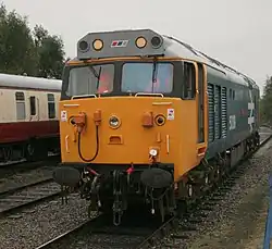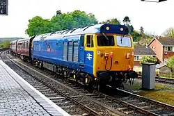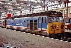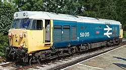 Externally, the locomotives all received high-intensity headlights, which changed the appearance of the front end. Starting with 50006, the first six refurbished locomotives were outshopped in the standard BR Blue livery. However, 50006 Neptune and 50017 Royal Oak initially ran with blanking plates covering the headlight apertures, prior to headlights becoming available.[9] In August 1980, 50023 Howe became the first to be outshopped in a revised livery with wrap around yellow cabs, black cab window surrounds, grey roof, large bodyside numerals and BR logo, in a livery that became known as BR Large Logo Blue.[12] The final loco to be refurbished was 50014 Warspite, which was released back into traffic in December 1983. The last member of the class to be painted from original plain blue into the Large Logo blue livery was 50013 Agincourt, following release from an intermediate overhaul at Doncaster in September 1984.[9]