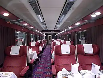 ![]() The interior of a Mark 2 Open First showing the former Virgin Trains West Coast Burgundy seat moquette trim | |