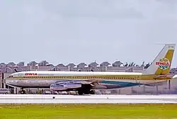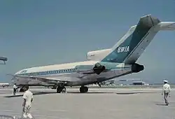 For BWIA the jet age began in 1964 with the introduction of new Boeing 727-100 jetliners billed as the Sunjet,[6] which replaced the Viscount turboprops on the New York route. According to its timetable, in 1968 the airline was operating nonstop Boeing 727 flights from New York to Antigua with continuing no change of plane 727 service to Barbados, St. Lucia and Port of Spain as well as nonstop 727 flights from Miami to Grand Cayman and Montego Bay with continuing no change of plane 727 service to Kingston, San Juan, Puerto Rico, Antigua, St. Lucia, Barbados and Port of Spain, and was also serving Caracas, Guyana, Suriname and Tobago with the 727.[7] In early 1971 four second-hand Boeing 707 series 200 airliners were purchased from Braniff International Airways and operated on US and intra-Caribbean services until their disposal in late 1975.[8]