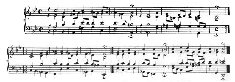 Bach set the tune in a four-part setting, BWV 301,[50] and introduced dramatic syncopation for the beginning "Komm" ("come").[41] At the end of the penultimate line, torment and dissonance are transformed into glory and harmony and illuminate the words "Denn durch dich komm ich herein / zu dem schönsten Jesulein" ("For through you I will come to my beloved Jesus").[26] As Whittaker comments: "The voices are low-lying, the harmonies are richly solemn; it makes a hushed and magical close to a wonderful cantata."[47] Gardiner notes that it is Bach's only setting of Crüger's melody, which recalls the style of his father's cousin Johann Christoph Bach whom Bach regarded as a "profound composer".[39]