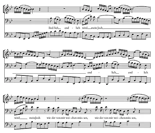 The third movement, the da capo aria "Endlich, endlich wird mein Joch wieder von mir weichen müssen" ("Finally, finally my yoke must fall away from me"),[26] illustrates a passage from Isaiah. The full German text with Drinker's English translation reads: