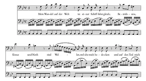 In the second movement, the recitative "Mein Wandel auf der Welt ist einer Schiffahrt gleich" ("My pilgrimage in the world is like a sea voyage"),[26] the sea is evoked by the undulating cello accompaniment of the semiquaver arpeggiation.[41][42] The German text and Drinker's English translation read:
