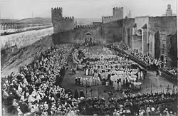 Bab Dekkakin itself was restored and modified in 1884, in the reign of Sultan Moulay Hassan.[5][4] In particular, the gate's central arch was opened up to provide a straight or direct passage across it instead of the original bent entrance, in order to facilitate circulation (similar to what was later done to Bab Semmarine too).[4] In or after 1912, another passage or archway was opened on the east side of the central arch (to the left when seen from the Old Mechouar) and was given a similar decorative outline as the western archway in order to create visual symmetry.[4] The overall form of the gate, however, including the massive towers flanking it, appear to be original from the Marinid period.[3] Up to the early 20th century, there was also a prison attached to Bab Dekkakin, where prisoners serving long sentences were kept.[2]: 267