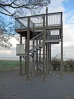 On September 21, 1922, the Gebirgsvereinssektion Golberode-Babisnau, serving as the builder, celebrated the inauguration of a new four-meter-high lookout scaffold. This construction took two weeks to complete. A redthorn hedge was planted in 1925.[13] A decree issued by the district governor of Dresden-Bautzen on December 28, 1936, designated the poplar as a natural monument under the Reichsnaturschutzgesetz (RNG) 128 years after its planting.[14] From 1944 until the end of World War II, an anti-aircraft squadron was stationed at the poplar.[8] As the German lines on the ground failed to hold, the poplar stood at the center of the war effort, and shortly before the war's end, there were plans to cut it down due to its status as a prominent visual marker. However, these plans were not carried out. In 1945, the Mountain Club disbanded, and the parcel containing the poplar and the Bismarck oak came under the care of the municipality of Bärenklause-Kautzsch.[15] In 1957, Babisnau was annexed to the municipality of Bärenklause-Kautzsch in the district of Freital. A year later, on August 23, 1958, the Freital District Council designated the poplar as a natural monument for the second time in a resolution (108/58). During the late 1950s, the lookout structure was closed by the building authorities due to its unsafe condition resulting from weathering and wanton damage. However, in 1962/63, the Friends of Freital built a new steel viewing platform to replace the old one.[16] On June 21, 1961, the Babisnau poplar with parcel 36a and the two surrounding parcels 35a and 40 were declared public property, which made them subject to state administration.[12] However, the care remained with the municipality. During a strong thunderstorm on July 20, 1967, with hail following temperatures of 30 degrees Celsius, the poplar lost a third of its now large crown.[17] One of the three main shoots going upward broke off, causing the crown to lose its spherical shape.[17] The height was reduced from about 26 to about 20 meters.[18] Because of its size, two tractors were needed to haul away the broken branch. From then on, the crown of the Bismarck oak, which was also large by then, increasingly took over the role of an eye-catcher from afar.[19]
