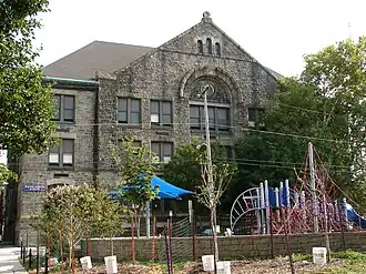 The Alexander Dallas Bache School was designed by Lloyd Titus and built between 1905 and 1906. It is a three-story, L-shaped, stone building, which was created in the Romanesque-style. It features a central projecting gable elaborate arched window.[2] It is named for Philadelphia native Alexander Dallas Bache (1806–1867), an American physicist, scientist and surveyor.