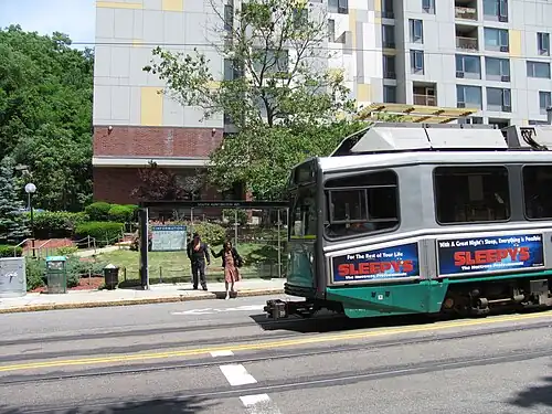 Back of the Hill station is a surface stop on the light rail MBTA Green Line E branch, located in the Mission Hill neighborhood of Boston, Massachusetts. It is named after, and primarily serves, the adjacent Back of the Hill apartment complex, a Section 8 development for elderly and disabled residents. Back of the Hill is located on the street running section of the E branch on South Huntington Avenue. The station has no platforms; passengers wait in bus shelters (shared with route 39 buses) on the sidewalks and cross a traffic lane to reach Green Line trains.[2][3]