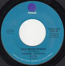 "Bad Moon Rising" is a song written by John Fogerty and performed by Creedence Clearwater Revival. It was the lead single from their album Green River and was released on April 16, 1969 four months before the album. The song peaked at No. 2 on the Billboard Hot 100 chart on 28 June 1969 and reached No. 1 on the UK Singles Chart for three weeks in September of that year (see 1969 in music). It was CCR's second gold single.[4]