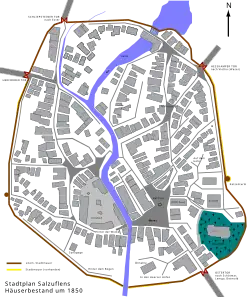 The first mention of the settlement of Uflon comes in the middle of the eleventh century and of a place of salt nearby. In Old High German "Uflon" means The Woods/Forest. This later evolved into Uflen, Mitteluflen and Dorf Uflen. Therefore, the entire name means The salt baths in the woods.[7]