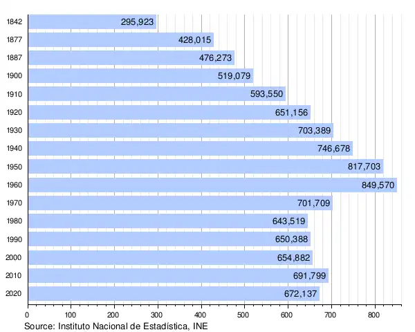 The population in the province of Badajoz has been characterized by a constant growth until the 1960s, when a strong exodus towards more prosperous areas of the country began, mainly Catalonia and Madrid, reducing the population by almost 200,000 inhabitants in a matter of 20 years. Since the 1980s the population has stagnated below 700,000, with a slight growth until 2010, when the trend is again reversed and the province loses population again. If we observe the trend by municipalities, we can see how the municipalities located in the mountains to the east and south of the province are constantly losing population while those located near the population centres of Badajoz, Mérida, Don Benito or Almendralejo are growing.[3]