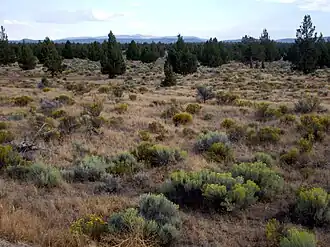 The wilderness is situated on high desert terrain and is associated with a volcanic rootless shield.[6][7] This broad 10-to-12-kilometre (6.2 to 7.5 mi) volcanic shield issued lava from a rootless vent.[6] The lava flow dates to about 80,000 years old and comes from a main vent further up the slopes of Newberry Volcano.[6][8] This main vent was located near Lava Top Butte and the lava that came out of this vent travelled through the Arnold Lava Tube System to arrive at the current location of the Badlands.[6] An irregularly-shaped pit crater at the top of the shield marks the site where lava flowed in all directions to create the Badlands.[8] Lava tubes acted as conduits for the lava in some instances and are evidenced on the surface by tumuli, also known as pressure ridges.[7][9] Soils in the Badlands were largely formed from ash associated with the eruption of Mount Mazama some 7,700 years ago.[10][11]