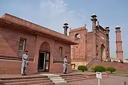 The mosque's full name "Masjid Abul Zafar Muhy-ud-Din Mohammad Alamgir Badshah Ghazi" is written in inlaid marble above the vaulted entrance.[26] The mosque's gateway faces east towards the Alamgiri Gate of the Lahore Fort, which was also commissioned by Aurangzeb. The massive entrance and mosque are situated on a plinth, which is ascended by a flight of 22 steps at the mosque's main gate which.[27] The gateway itself contains several chambers which are not accessible to the public.