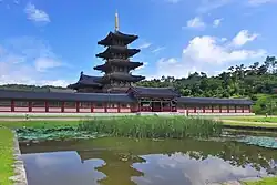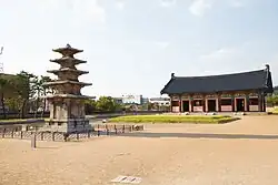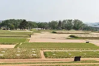 The Jeongnimsa Temple Site layout is a popular architectural layout throughout Korea and has a "pagoda–prayer hall–lecture hall layout".[2]: 12–13 It is located on a flat terrain and is in the backdrop of the Geumseongsan Mountain to the east and Busosan Mountain to the north. Built during the Sabi period, the temple has engravings on the pagoda that memorialize the Tang dynasty's victory over Baekje. The temple has a layout of a central gate, prayer and lecture halls, and the monks' residential area, all linked by passages. The buildings were made of wood founded over tiled plinths. The site has a five-story pagoda, 8 metres (26 ft) in height with a low platform and a high main body on its first level, and with reducing size at further higher levels. Other archaeological finds include many roof tiles and clay figurines.[2]: 60, 62