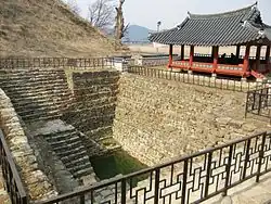 The Busosanseong Fortress, located on a small hill, was known in the early period as Sabiseong. It formed the backyard garden of the royal palace and was an emergency escape route.[3][2]: 12–13 Archaeological excavations carried out in 1993 unearthed this fort. It is situated on the Busosan Mountain (elevation 106 metres (348 ft)) located on the northern extremity of Buyeo, on the west bank of the Geumgang River. The fort wall has a perimeter of 2,495 metres (8,186 ft) with a base width of 5 to 6 metres (16 to 20 ft), and it is 3 metres (9.8 ft) in height built by the rammed earth method. It has two gates, one on the south and the other on the east; the south gate is the main gate. The finds here also indicate that the fort was in use as a military establishment for more than 1,000 years.[2]: 58–59 The 'Nakhwaam Rock', meaning "Rock of Falling Flowers", a rock ledge, is known for the Baekje's tragic legend of 3,000 royal ladies committing suicide by jumping off the cliff.[3][2]: 12–13