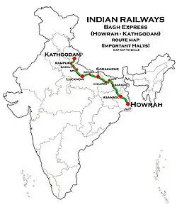 The 13019 / 13020 Bagh Express is an express type train of Indian Railways connecting Kolkata (Howrah) with northern Indian town of Kathgodam (Uttarakhand).[1] It is a very popular train among tourists of Eastern India, who are going for the Uttarakhand and Jim Corbett National Park trip. It travels through Indian states of West Bengal, Jharkhand, Bihar, Uttar Pradesh, and Uttarakhand.