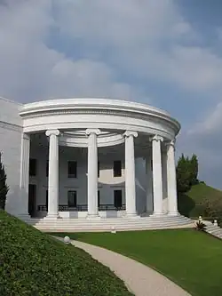 After ʻAbdu'l-Bahá's death, Shoghi Effendi was the head of the religion, and he directed the development of a number of separate projects in the area.[1] He renovated the house of Baháʼu'lláh in Bahji in 1929, and in the 1950s secured legal possession of the lands around the building, creating a number of gardens.[12] He also obtained possession of other sites around Acre related to Baháʼu'lláh's life, including the House of ʻAbbud. Around Haifa, he expanded the Shrine of the Báb by developing its golden-domed superstructure, and purchased lands surrounding the Shrine in order to create gardens. Shoghi Effendi had also decided that the buildings housing the institutions of the religion indicated in Baháʼu'lláh's Tablet of Carmel, including the Universal House of Justice, the as yet unestablished governing body of the worldwide Baháʼí community, would be arranged in the shape of an arc surrounded by gardens.[8] The fulcrum of this arc would be the Monument Gardens, which hold the graves of members of the Baháʼí holy family.[13] During his own lifetime he started the construction of one of the buildings comprising the arc, the International Archives building.[1] He also negotiated tax-exempt status for all Baha'i properties.[12] The religion's situation in Israel was clarified in an agreement signed in 1987 by then Vice-Premier and Foreign Minister, Shimon Peres, in which the government formally acknowledged the Baháʼí Faith as a “recognized religious community in Israel,” declared its "friendly relations" with the Baháʼí world community, noted that the "holiest places of the Baháʼí Faith, … are located in Israel", and confirmed "that the Universal House of Justice is the Trustee of the Baháʼí International Community over the Holy Places of the Baháʼí Faith in Israel and over the Baháʼí endowments in Israel".[12]