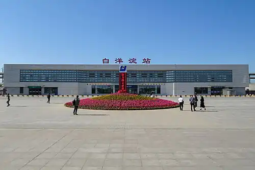 Baiyangdian railway station (Chinese: 白洋淀站; pinyin: Báiyángdiàn zhàn) is a station Tianjin–Baoding intercity railway in Rongcheng County, Xiong'an New Area, Baoding, Hebei. The station is named after the Baiyangdian (Baiyang Lake).