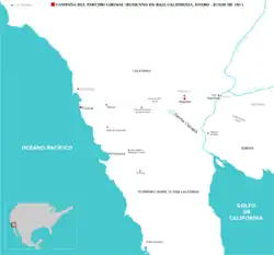 The PLM campaign in the so-called Northern Territory of Baja California began on January 29, 1911, when about 30 rebels guided by José María Leyva and Simón Berthold,[6] along with a group of residents, took the town of Mexicali without resistance; they opened the jail, occupied the barracks and confiscated government office funds. The majority of Mexicali residents crossed to Calexico, where they remained until June. Other settlers joined the rebels as well as many foreign socialists and anarchists; mainly militants (wobblies) of the Industrial Workers of the World (IWW). Later, on February 15 the PLM forces clashed with and defeated federal troops led by Porfirista Colonel Celso Vega. The victory increased the morale and number of the rebels; by the end of February there were already about 200 men (both Mexicans and foreigners) up in arms.[15] In total, the Magonista forces reached 500 men, of which approximately 100 were Americans, including the wobblies Frank Little and Joe Hill.[16] For its part, the US government in Calexico and Yuma had offered military support to the Mexican government[17] to protect the hydraulic works that American engineers had carried out in the Colorado River since December 1910 with the authorization of the Porfiriato.[18] The British sent HMS Shearwater and HMS Algerine to invade and occupy San Quintín to protect British interests and assets from the Magonistas.[19]