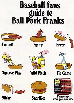In 1957, Hygrade Food Products, a Detroit-based meatpacking company owned by the Slotkin family, under the direction of Hugo Slotkin, acquired the exclusive contract to supply hot dogs at Detroit's Tiger Stadium (then known as Briggs Stadium).[3][4] In response, a Hygrade sausage maker, Gus Hauff, developed a specific formulation, incorporating veal and a finer emulsion, creating a larger, one-eighth-pound hot dog, in contrast to the park's previous one-tenth-pound offerings.[4][5] The product's popularity at the stadium facilitated its subsequent commercial distribution in 1959 as "Ball Park Franks". The name's origin is subject to differing accounts, with attribution given to either saleswoman Mary Ann Kurk[5][6][7] or salesman Bill Willtsie.[4] In 1965, the company's tagline, "They plump when you cook them", was developed by the W.B. Doner agency, and the product was launched nationally.[4]
