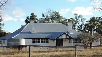 The detached kitchen is situated approximately 10 metres (33 ft) to the north-west of the house, connected to it by a concrete path. It is a timber-framed building elevated on low timber stumps and has a hipped roof, the ridgeline of which runs almost perpendicular to that of the main house. The roof is clad in corrugated iron sheeting. An approximately 1.5-metre (4 ft 11 in) wide verandah encircles the building on three sides. The main roof covers these areas and is supported at each edge by timber posts. On the northern elevation the plane of the roof does not extend over the end wall, which is of brick with two separate chimneys and a stove alcove, which has a skillion roof clad in corrugated iron sheeting.[1]