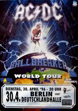 The Ballbreaker World Tour was a concert tour played by the Australian hard rock band AC/DC, in support of their thirteenth studio album Ballbreaker, which was released on 26 September 1995. This tour had 5 legs around the world lasting 11 months starting on 12 January 1996 in Greensboro, North Carolina finishing on 30 November 1996 in Christchurch, New Zealand.