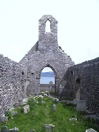 Ballinskelligs Abbey (Irish: Prioreacht Bhaile an Sceilg) was an Augustinian priory, (also known as the Priory of the Arroasian Canons of the Order of St Augustine). It is located on the Iveragh Peninsula in County Kerry, Ireland. The medieval priory, built in the 12 and 13th centuries, was established as a mainland priory for the monks of Skellig Michael who were abandoning the island due to adverse weather conditions.[1] The ruined medieval site originally consisted of church, cloister, Prior's house, refectory, and burial ground.