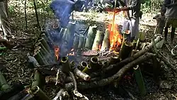 - Cut bamboo is raised clear of the ground and leaned against the rest of the clump for one to two weeks until leaves turn yellow to allow full consumption of sugars by the plant.