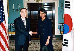 In 2004, Ban replaced the resigning Yoon Young-kwan as foreign minister of South Korea under president Roh Moo-hyun.[21] At the beginning of his term, Ban was faced with two major crises: in June 2004 Kim Sun-il, a South Korean working as an Arabic translator, was kidnapped and killed in Iraq by Islamic extremists; and in December 2004 dozens of Koreans died in the 2004 Indian Ocean tsunami. Ban survived scrutiny from lawmakers and saw an upturn in his popularity when talks began with North Korea.[27] Ban became actively involved in issues relating to North-South Korean relationships.[26] In September 2005, as foreign minister, he played a leading role in the diplomatic efforts to adopt the Joint Statement on resolving the North Korean nuclear issue at the fourth round of the Six-party talks held in Beijing.[31][32]