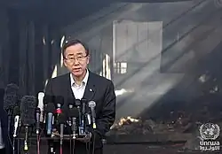 On Thursday, 22 March 2007, while Ban was taking part in the first stop of a tour of the Middle East, a mortar attack hit just 80 meters (260 ft) from where the Secretary-General was standing, interrupting a press conference in Baghdad's Green Zone, and visibly shaking Ban and others. No one was hurt in the incident.[74] The United Nations had already limited its role in Iraq after its Baghdad headquarters was bombed in August 2003, killing 22 people. Ban said, however, that he still hoped to find a way for the United Nations to "do more for Iraqi social and political development".[75]