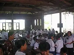 Within Ban Sam Ruen is Wat Rat Samosom School, referred to by most as Sam Ruen School. Wat Rat Samosom School is Sam Ruen's elementary and high school, which provides basic education for villagers of Ban Sam Ruen and neighboring villages in Nakhon Pa Mak. It is one of four elementary schools in Nakhon Pa Mak, and the subdistrict's only high school. It was strictly an elementary school until around 1990, when an additional high school building was added. Prior to 1990, Nakhon Pa Mak children who wished to attend high school were required to find private transportation to the nearest high school in Mueang Bang Krathum. Each day at Sam Ruen School begins with the raising of the Thai flag, conducted by one male and one female student, while the remainder of the student and faculty body sing the Thai national anthem. Classes include Thai language, mathematics, Thai history, civics, sewing and agriculture. Lunch is provided by parents of the students who take turns volunteering in the preparation and food service. There are recreational and intramural sports activities on the soccer field and basketball court, but no competitive sports teams.