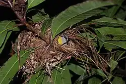 The bananaquit is known for its ability to adjust remarkably to human environments. It often visits gardens and may become very tame. Its nickname, the sugar bird, comes from its affinity for bowls or bird feeders stocked with granular sugar, a common method of attracting these birds.[31] The bananaquit builds a spherical lined nest with a side entrance hole, laying up to three eggs, which are incubated solely by the female.[35] It may also build its nest in human-made objects, such as lampshades and garden trellises. The birds breed all year regardless of season and build new nests throughout the year.[31]