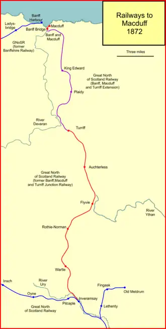 - ^ Duncan McLeish, Rails to Banff, Macduff and Oldmeldrum: Three Great North of Scotland Railway Branch Lines, Great North of Scotland Railway Association, 2014, ISBN 978-0902343-26-9, page 5