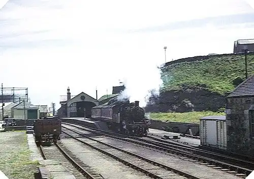 The line from Tillynaught opened in 1859 and a temporary terminus opened on 30 July 1859.[1] A permanent station opened the following year. As originally built, there was a single platform and a goods line through to the quayside at Banff harbour, but that was cut back prior to 1900, when a second platform line was constructed.