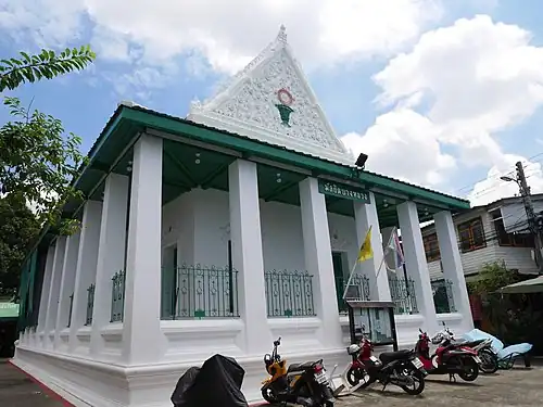 Bang Luang Mosque (Thai: มัสยิดบางหลวง) is a historic mosque, located in Soi Arun Amarin 7, New Arun Amarin Road, Wat Kanlaya Subdistrict, Thon Buri District, of Bangkok. The mosque is situated on the Thonburi side within Kudi Khao Community by the Khlong Bangkok Yai (formerly Khlong Bang Luang) near mouth of Chao Phraya River. The mosque is also known as Kudi Khao (กุฎีขาว, lit. 'white cloister') and Kudi To Yi (กุฎีโต๊ะหยี, lit. 'To Yi's cloister').