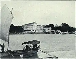 When Bangkok became capital of the Rattanakosin Kingdom in 1782, fringe communities developed outside its city walls, mainly along the banks of the Chao Phraya River. Downstream of the walled city beyond the Chinese community of Sampheng, the river's eastern bank became home to several ethnic communities, including Portuguese and Chinese Catholics centred around the Holy Rosary Church, Malays, and Vietnamese refugees led by the future Emperor Gia Long.[2] The area gradually attracted European visitors, beginning with French Catholic missionaries, who eventually took over the management of the church. They also founded a new church (later to become the Assumption Cathedral) some distance further south in 1822, and based their mission offices there. They were followed by Protestants, mainly Americans, in the 1830s. Portugal was the first foreign nation to establish a consulate in the capital,[3] having been granted a piece of land in the area in 1820.[4]